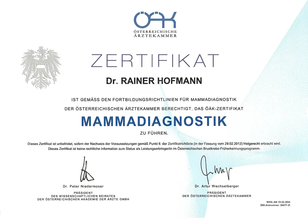 Unsere RADIOLOGIE AM SCHILLERPARK – Dr. Rainer Hofmann in Linz ist als Untersuchungseinheit im Rahmen des nationalen Brustkrebsfrüherkennungsprogramms „früh erkennen“ zertifiziert. Mithilfe spezieller Röntgentechnik kann das Brustdrüsengewebe detailliert dargestellt werden. Um optimale Bildqualität zu gewährleisten, wird die Brust bei der Untersuchung kurzzeitig zusammengedrückt. Die Durchführung erfolgt besonders schonend durch unsere erfahrenen, weiblichen Fachkräfte. Jede Aufnahme wird meist noch am selben Tag von einem zweiten zertifizierten Radiologen beurteilt.